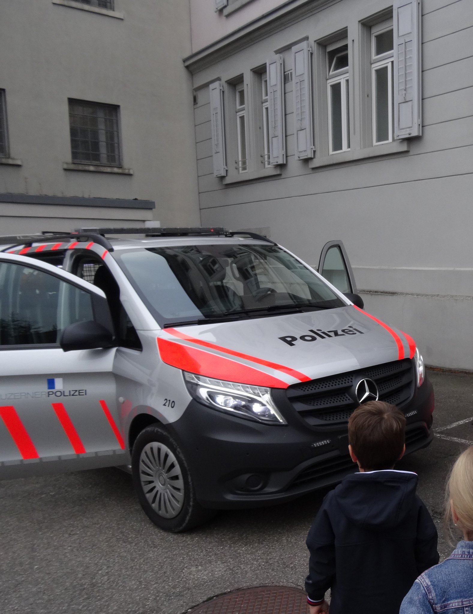 Vorstellung und Präsentation eines Polizeifahrzeuges und des Hundeführerwesens mit praktischer Übung im Gelände.